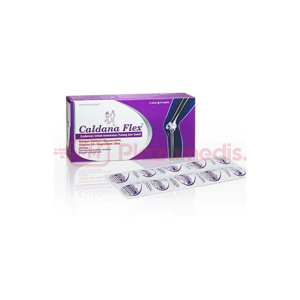 Caldana Flex Kaplet merupakan suplemen makanan yang membantu memelihara kesehatan tulang dan sendi yang mengandung Glucosamine, Calcium, Vitamin D3, Magnesium dan Zinc. Dengan bertambahnya usia mengakibatkan kepadatan tulang berkurang yang bisa menjadikan tulang keropos atau bisa disebut juga osteoporosis. Caldana Flex juga diperkaya dengan kandungan vitamin D3, Magnesium, dan Zinc yang akan membantu penyerapan kalsium ke dalam tulang. Dengan adanya kandungan ini, tulang akan menjadi tetap padat sehingga Anda terhindar dari bahaya osteoporosis. Berkegiatan pun lebih nyaman. Caldana Flex cocok dikonsumsi oleh pria dan wanita berusia 50 tahun keatas. Kurangnya kalsium merupakan penyebab utama keroposnya tulang dan radang sendi. Dengan mengkonsumsi Caldana Flex secara teratur (sesuai anjuran) bergerak menjadi lebih nyaman.