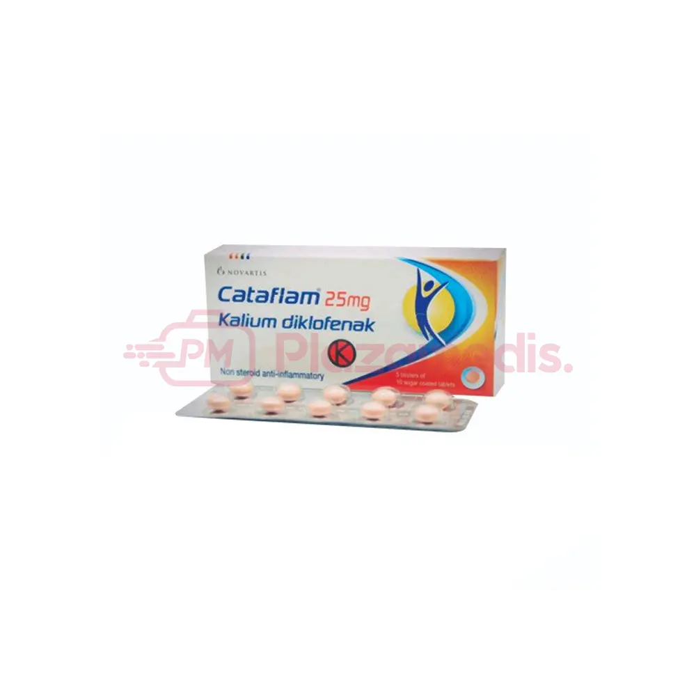 Cataflam 25 mg merupakan obat anti nyeri dengan kandungan Kalium Diklofenak. Kalium Diklofenak atau Potassium Diclofenac merupakan obat golongan Obat Antiinflmasi Non Steroid yang memiliki aktifitas antiinflamasi atau antiradang dan antinyeri. Obat ini digunakan untuk terapi akut & kronik tanda-tanda dan gejala-gejala RA (Rheumatoid Arthritis), OA (Osteoarthritis) & spondilitis ankilosa. Penatalaksanaan nyeri & dismenore primer, jika nyeri perlu diredakan dengan cepat. Pengobatan jangka pendek pada serangan migrain akut & nyeri & peradangan pasca operasi setelah operasi gigi & ortopedi. Dalam penggunaan obat ini harus SESUAI DENGAN PETUNJUK DOKTER.